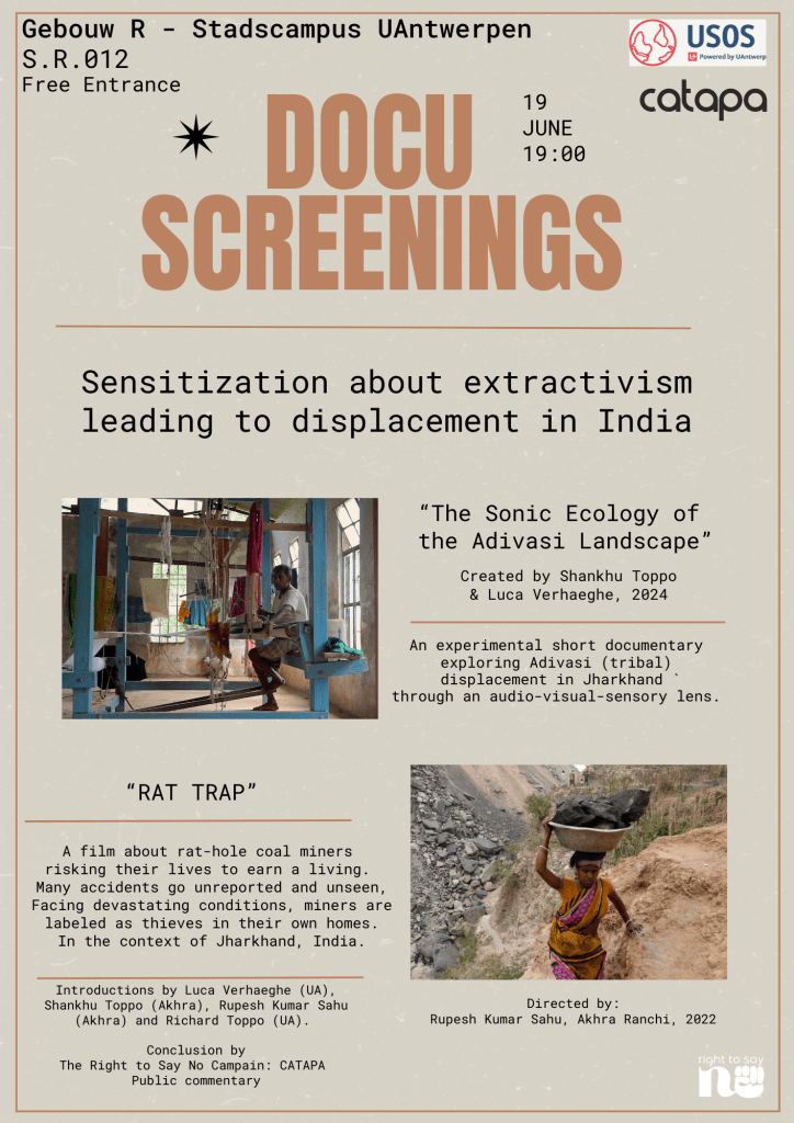 To picture this context more concretely, the movie “Rat Trap”, made by Akhra Ranchi, was screened with an online introduction from director Rupesh Sahu. This movie zooms in on the harsh reality of illegal coalminers in Jharkhand. We closed the evening with a message of hope through the presentation of “the Right to Say No” campaign. It is a campaign by CATAPA fighting mineral extraction and unjust land acquisition in South-America.